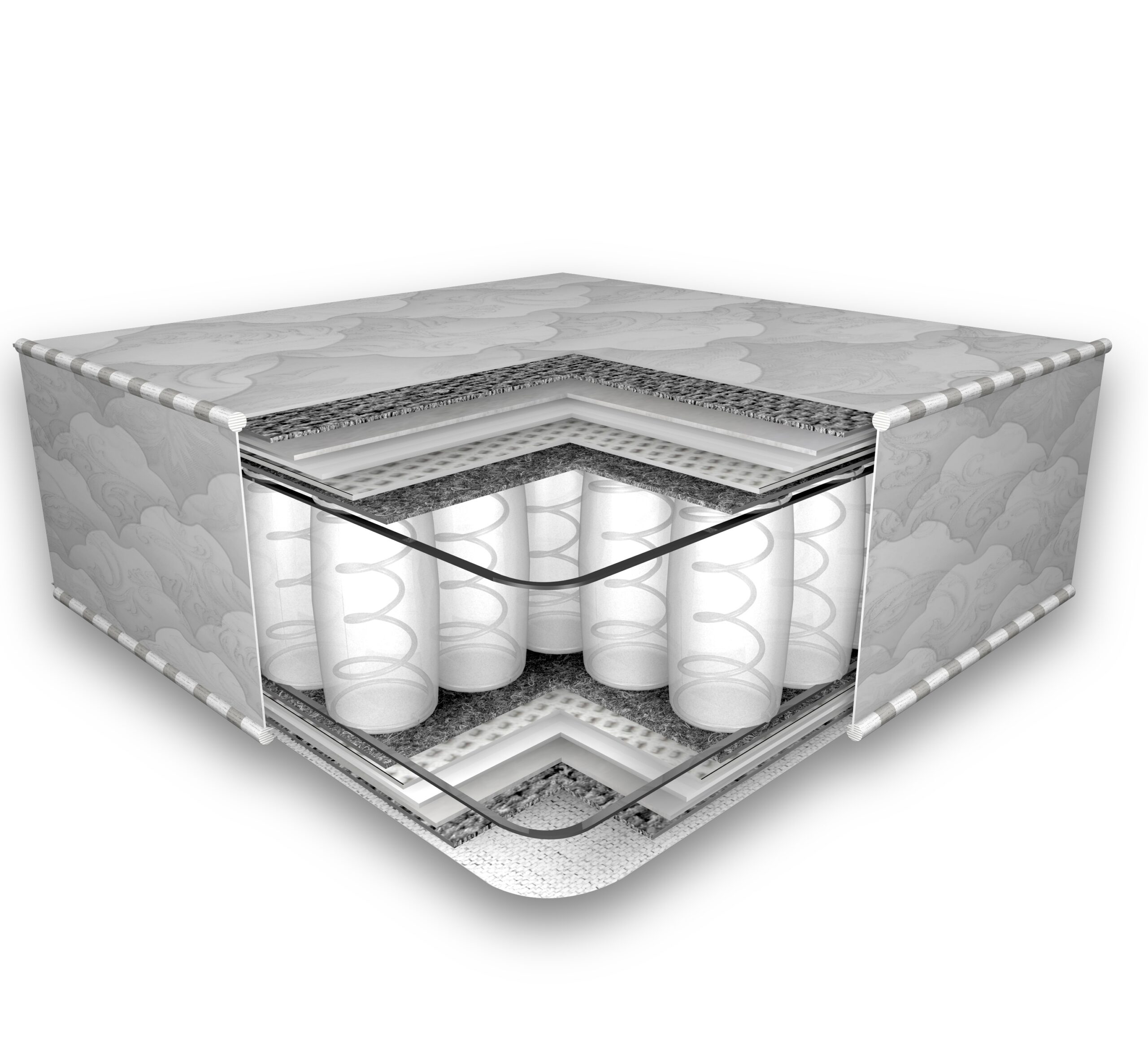 Composición del colchón: 1. Jacquard. 2. Algodón. 3. Fibra sintética. 4. Fieltro flexográfico. 5. Spunbond. 6. Fieltro térmico. 7. Lana. 8. Bloque de muelles ensacados.