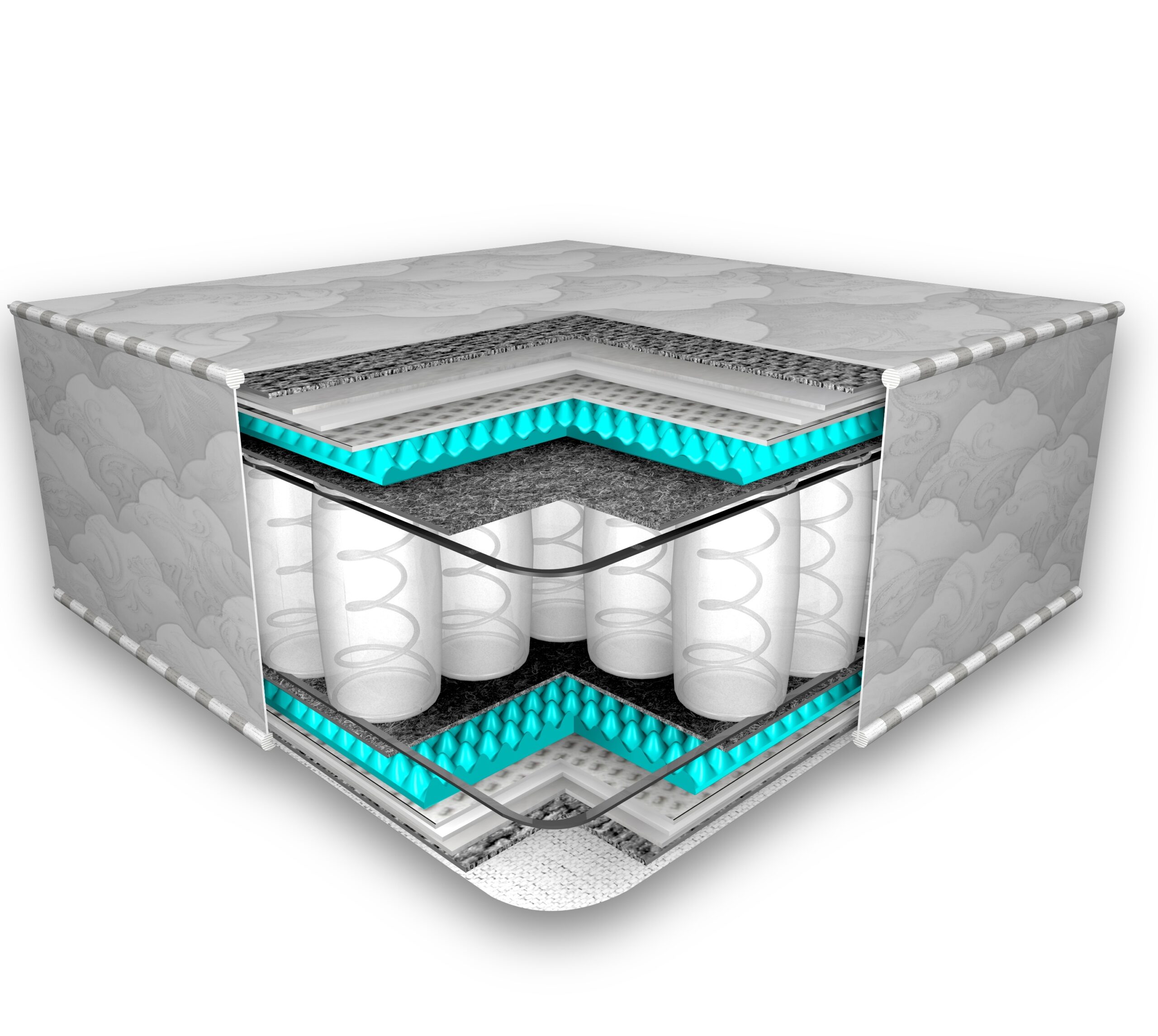 Composición del colchón: 1. Jacquard. 2. Algodón. 3. Fibra sintética. 4. Fieltro flexográfico. 5. Spunbond. 6. Espuma viscoelástica. 7. Látex natural. 8. Látex de coco…