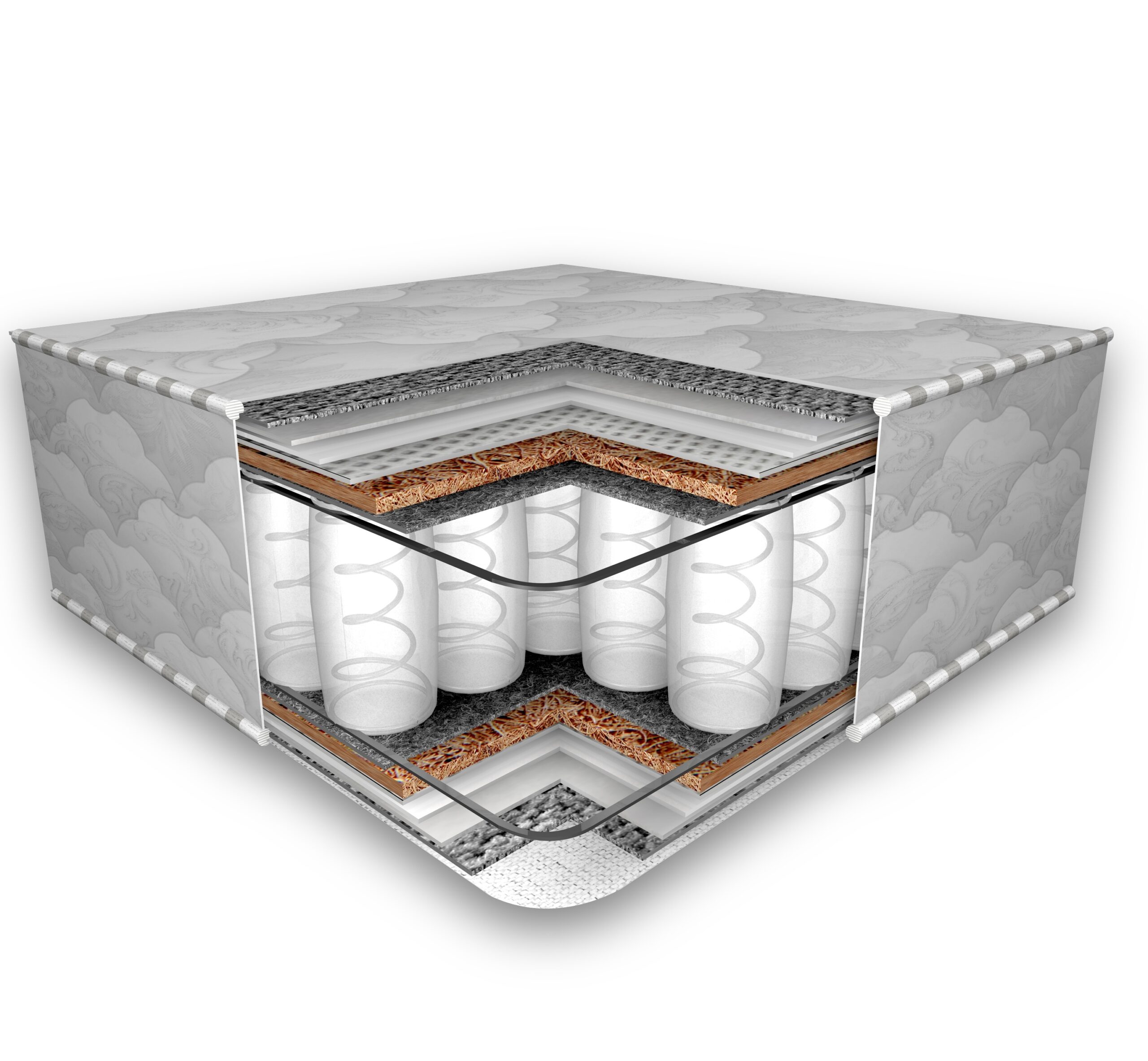 Composición del colchón: 1. Jacquard. 2. Algodón. 3. Fibra sintética. 4. Fieltro flexográfico. 5. Spunbond. 6. Látex de fibra de coco. 7. Fieltro térmico. 8. Lana. …