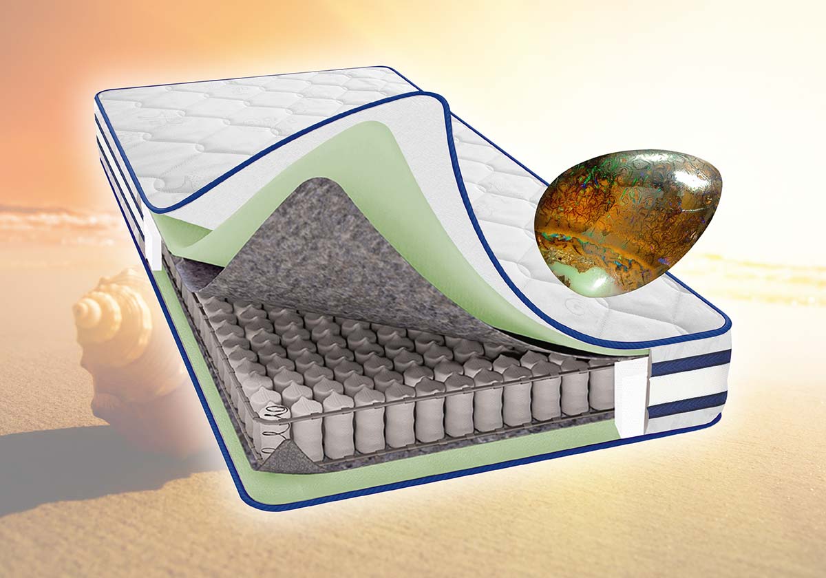 Composición del colchón: 1. Jacquard elástico. 2. Algodón. 3. Fiberflex. 4. Spunbond. 5. Biofoam. 6. Bloque de muelles ensacados. Colchones con un ancho de 800, 900…